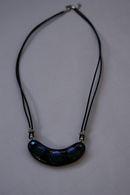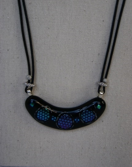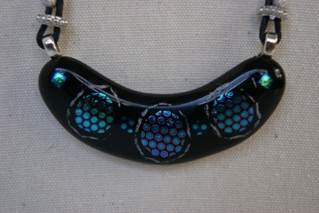 黒地にダイクロガラス(きらきら光るガラス)の玉虫色に輝く点の花