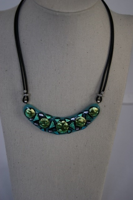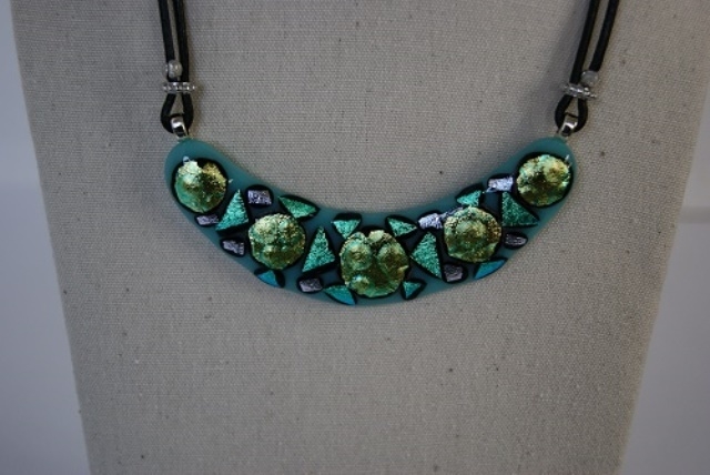 淡いブルーグリーン地にダイクロガラス(きらきら光るガラス)の金、グリーン、薄紫の華やかな花模様