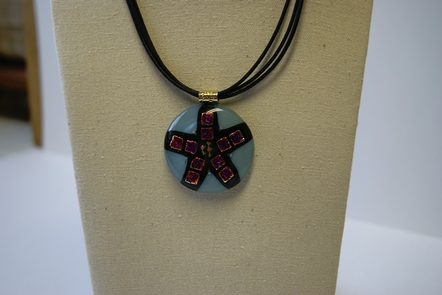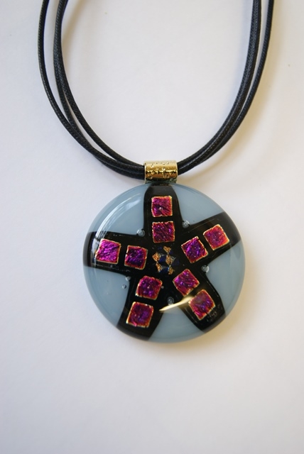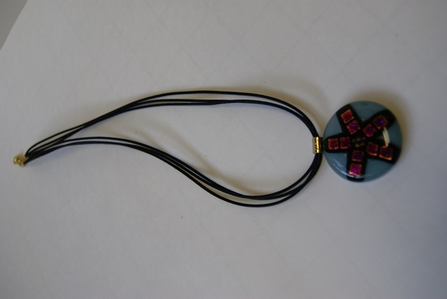 丸型ヘッドに綿紐3本。ブルーグレー地にルビー色を思わせるようなダイクロガラスで模様付け。大胆に華やかに装って頂きたいペンダント。