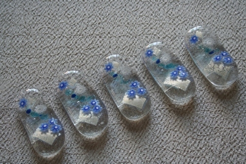 クリアー地に銀箔、ブルーと白の花が気品ある涼やかさを運びます。(1点のみ) 4,000円→2,500円 に値下げ。