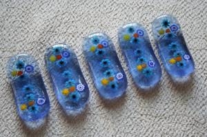 淡いブルー地に行儀良くお花を並べて。地のブルーに青い花が浮き出ます。(1点のみ)4,000円→2,500円 に値下げ。