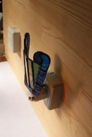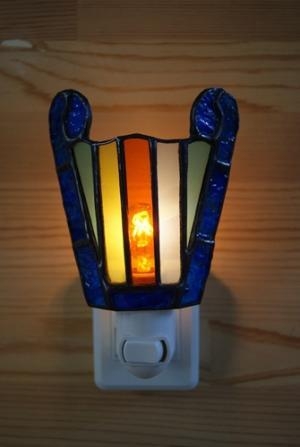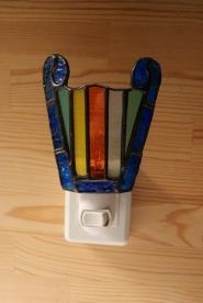 メロディーが聞こえてきそうな一面体のお休みランプ。一面だけれど真っ直ぐでなく、光を取り込めるようにカーブさせました。青、緑、グレー、オレンジ、黄のガラスを使用。サイズ H13.5cm、W10cm、D3.3cm、電球5W