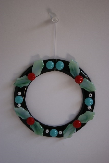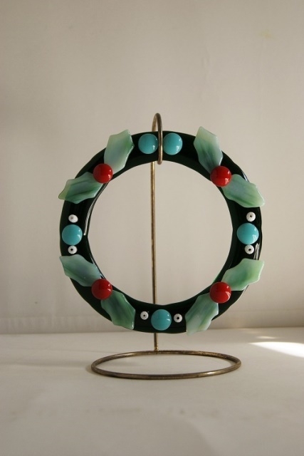 リングは二段重ねで焼成、玉、葉ともそれぞれ別焼成でガラスボンドで貼り付けしました。オリジナルのクリスマスリングです。ガラス製品ですので、ぶつけたり、落下させたりしない限り色は退化せず、いつまでも今の風合いを保ってくれます。