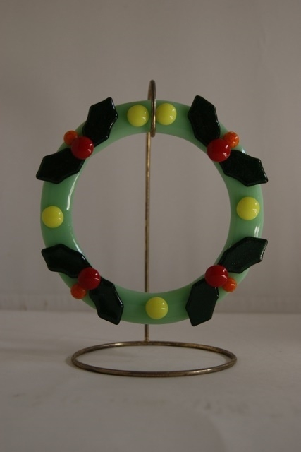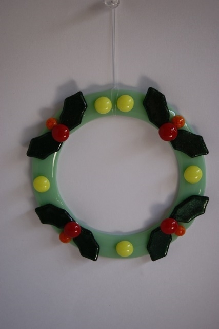 リングは二段重ねで焼成、玉、葉ともそれぞれ別焼成でガラスボンドで貼り付けしました。オリジナルのクリスマスリングです。ガラス製品ですので、ぶつけたり、落下させたりしない限り色は退化せず、いつまでも今の風合いを保ってくれます。