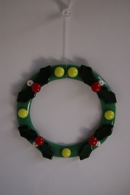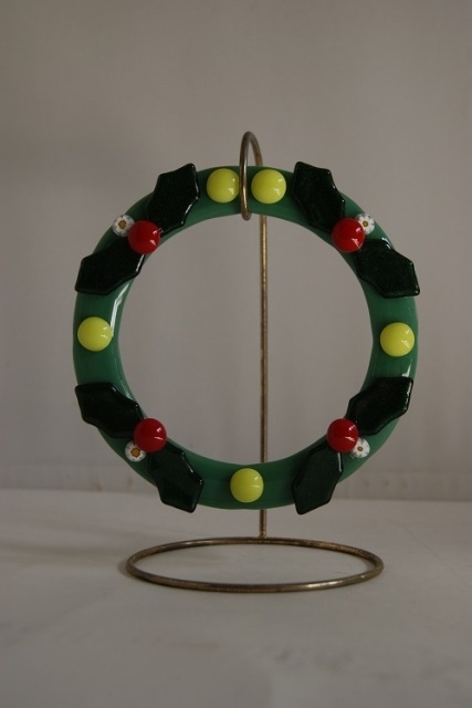 リングは二段重ねで焼成、玉、葉ともそれぞれ別焼成でガラスボンドで貼り付けしました。オリジナルのクリスマスリングです。ガラス製品ですので、ぶつけたり、落下させたりしない限り色は退化せず、いつまでも今の風合いを保ってくれます。
