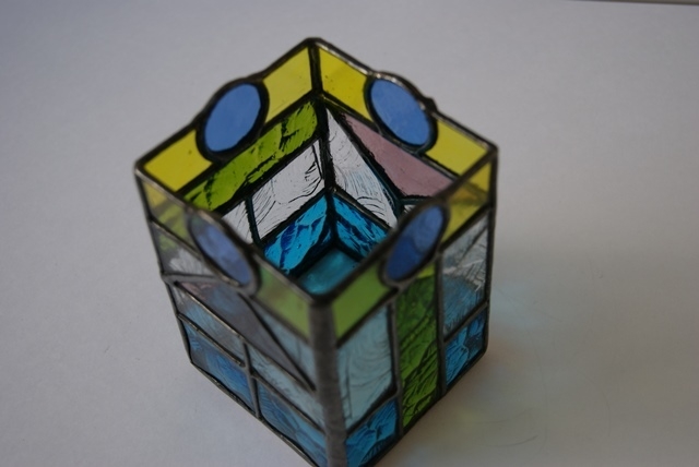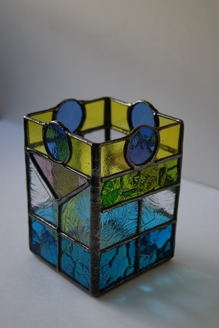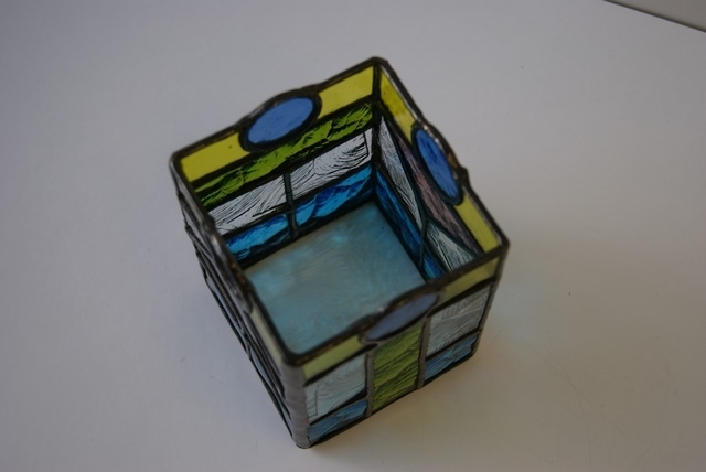 そばに置いて楽しくなるような、小さいけれどステンドグラスを感じて頂きたい一品です。小物にここまでデザインを拘る事もないのですが、制作の遊びでもありましたので、そばに置いてアイデアで楽しんで頂けたら嬉しいです。