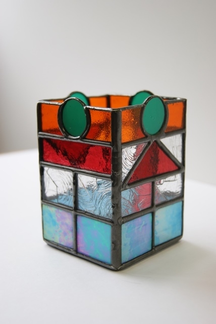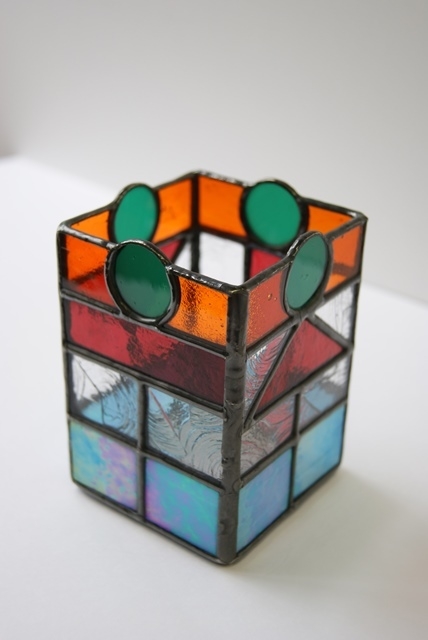 そばに置いて楽しくなるような、小さいけれどステンドグラスを感じて頂きたい一品です。小物にここまでデザインを拘る事もないのですが、制作の遊びでもありましたので、そばに置いてアイデアで楽しんで頂けたら嬉しいです。