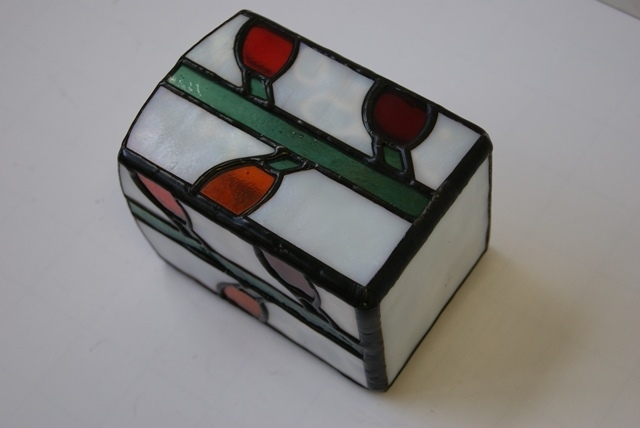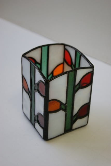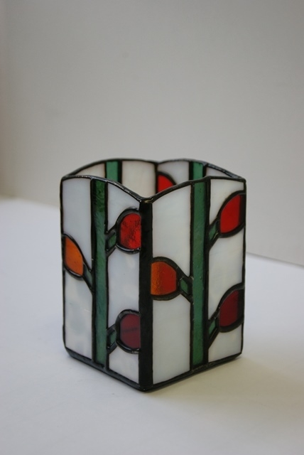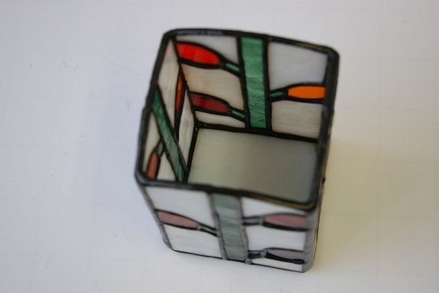 木の枝がささやきかけてくるようなイメージで制作しました。バックになるガラスの表面は白のイリデッセント(七色の光彩)です。基本は鉛筆や小物入れとしてお使い頂けますが、その他色々なお使い方をお楽しみ頂けます。小物ですので価格は抑えられておりますが、手の込んだ格安な一点です。