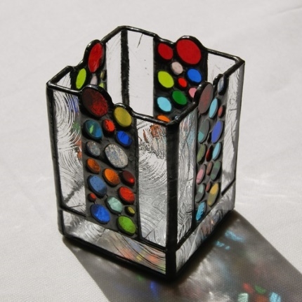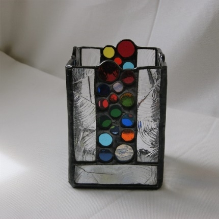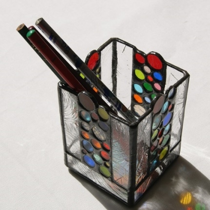 少し贅沢にガラスで出来た、ステンドグラスの鉛筆入れです。鉛筆に限らず、キャンドルホルダーにしたり、中に瓶等を入れて花や植物を飾ったり、と用途は沢山ありそうです。真ん中の部分は小さなカットガラスを敷き詰めてモザイクにしました。窓辺に置いたら、日の光の中に七色が浮かび上がりそうです。