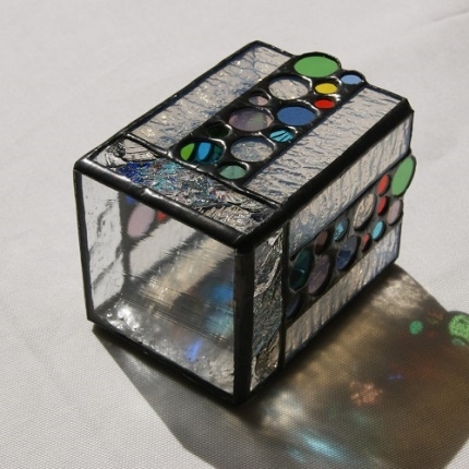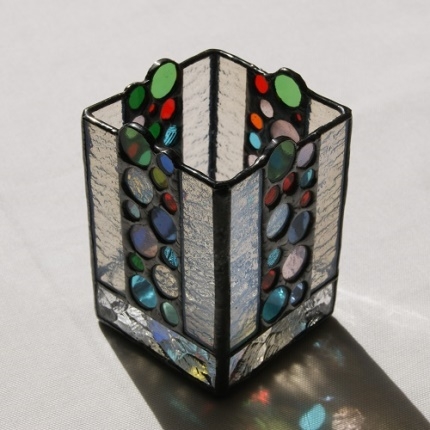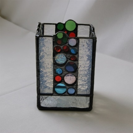 少し贅沢にガラスで出来た、ステンドグラスの鉛筆入れです。鉛筆に限らず、キャンドルホルダーにしたり、中に瓶等を入れて花や植物を飾ったり、と用途は沢山ありそうです。真ん中の部分は小さなカットガラスを敷き詰めてモザイクにしました。窓辺に置いたら、日の光の中に七色が浮かび上がりそうです。