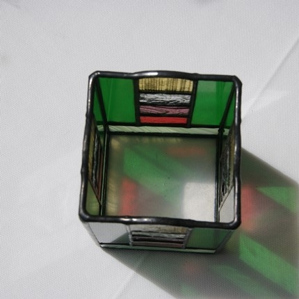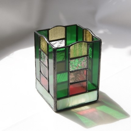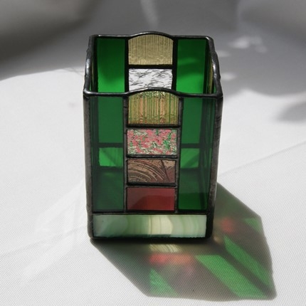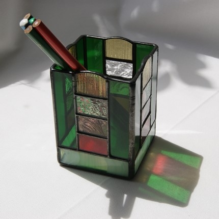 少し贅沢にガラスで出来た、ステンドグラスの鉛筆入れです。鉛筆に限らず、キャンドルホルダーにしたり、中に瓶等を入れて花や植物を飾ったり、と用途は沢山ありそうです。真ん中の部分は周りの色に合わせて、マルチ色の4段積みにしました窓辺に置いたら、日の光の中に七色が浮かび上がりそうです。