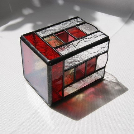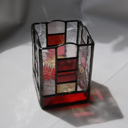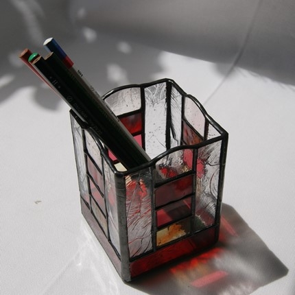 少し贅沢にガラスで出来た、ステンドグラスの鉛筆入れです。鉛筆に限らず、キャンドルホルダーにしたり、中に瓶等を入れて花や植物を飾ったり、と用途は沢山ありそうです。真ん中の部分は周りの色に合わせて、マルチ色の4段積みにしました。窓辺に置いたら、日の光の中に七色が浮かび上がりそうです。