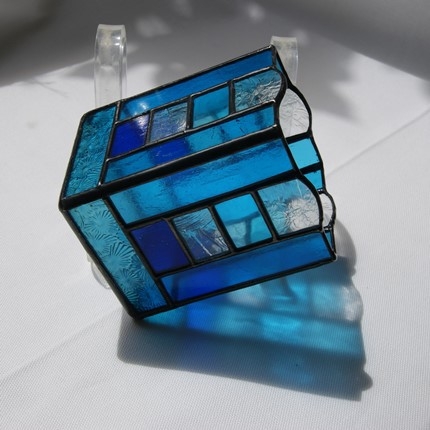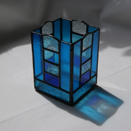 少し贅沢にガラスで出来た、ステンドグラスの鉛筆入れです。鉛筆に限らず、キャンドルホルダーにしたり、中に瓶等を入れて花や植物を飾ったり、と用途は沢山ありそうです。真ん中の部分は周りの色に合わせて、マルチ色の4段積みにしました。窓辺に置いたら、日の光の中に七色が浮かび上がりそうです。