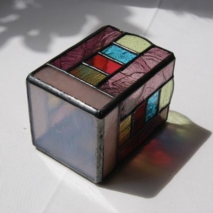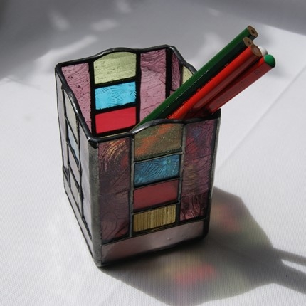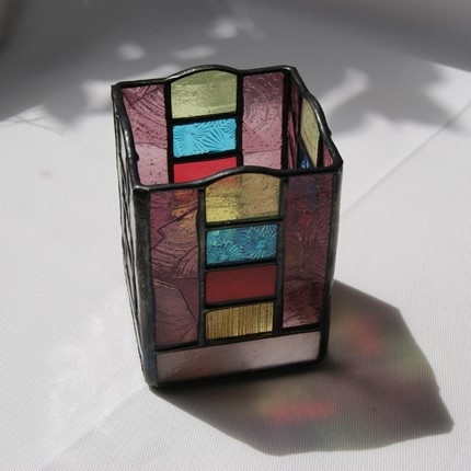 少し贅沢にガラスで出来た、ステンドグラスの鉛筆入れです。鉛筆に限らず、キャンドルホルダーにしたり、中に瓶等を入れて花や植物を飾ったり、と用途は沢山ありそうです。真ん中の部分は周りの色に合わせて、マルチ色の4段積みにしました。窓辺に置いたら、日の光の中に七色が浮かび上がりそうです。