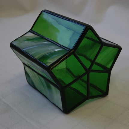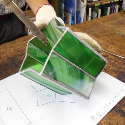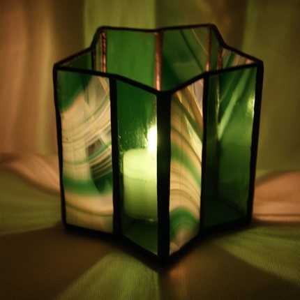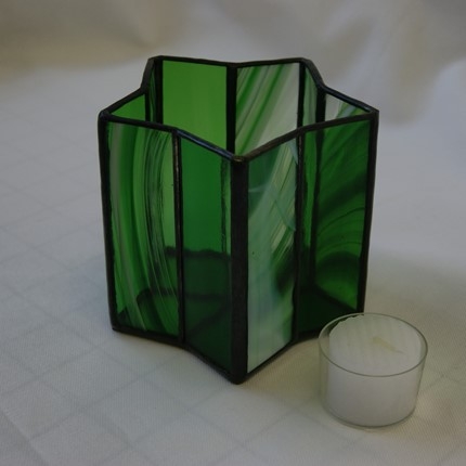 感じて頂けたらと思います。星型の底に長方形にガラスで形作っていきますが、綺麗な星を創るのは思っているよりなかなか難しいです。グリーンのガラス2種類を使用。サイズ 底の直径10cm、高さ10cm、ろうそく付き