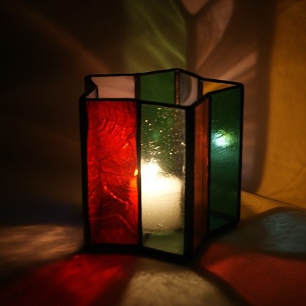 感じて頂けたらと思います。星型の底に長方形にガラスで形作っていきますが、綺麗な星を創るのは思っているよりなかなか難しいです。10色のガラス使用。サイズ 底の直径10cm、高さ10cm、ろうそく付き