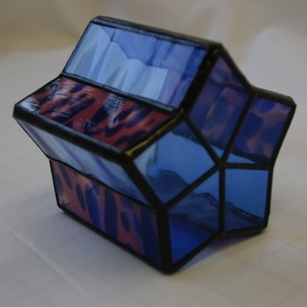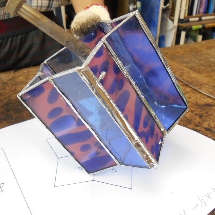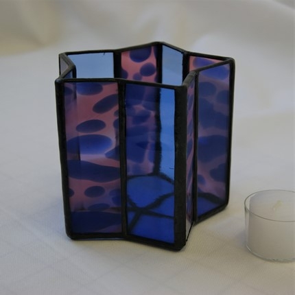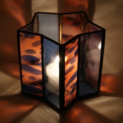 感じて頂けたらと思います。星型の底に長方形にガラスで形作っていきますが、綺麗な星を創るのは思っているよりなかなか難しいです。ブルー、ピンクにブルーのガラスを使用。サイズ 底の直径10cm、高さ10cm、ろうそく付き