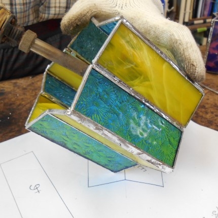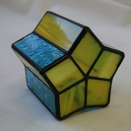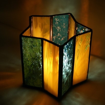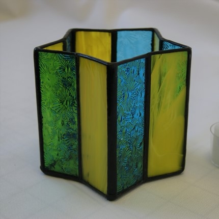 過ごして頂けたらと思います。底の部分の星型に合わせて、長方形の10枚のガラスで星を創っていきます。簡単そうですがなかなか難しい、そんなキャンドルホルダーです。黄色、模様入り水色ガラス使用
