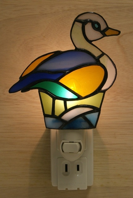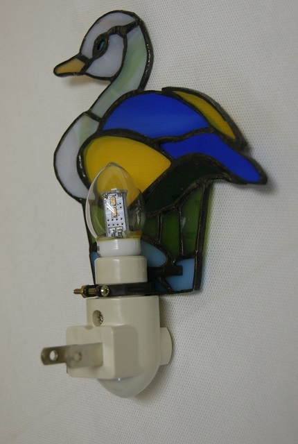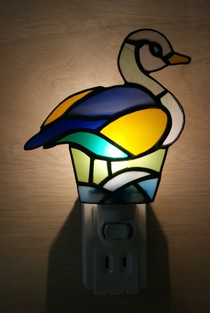 あでやかに水鳥のお休みランプです。ブルー系でまとめた可愛い色合いです。小さな目も入っています。一面体ですが明かりを取り込めるように、カーブをかけて創りました。