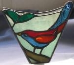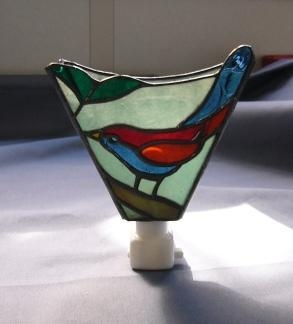 人気のおやすみランプ。バージョンアップしました。価格は今までどうりです。電球は5Wと15W付き、お好みの明るさが出来ます。淡いグリーン地に赤と青(模様入り)の鳥。幸せな灯りを運んで来てくれそうです。サイズ H14cm W12cm D6cm。 代引き手数料なし。