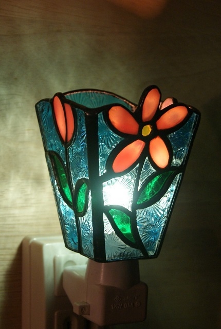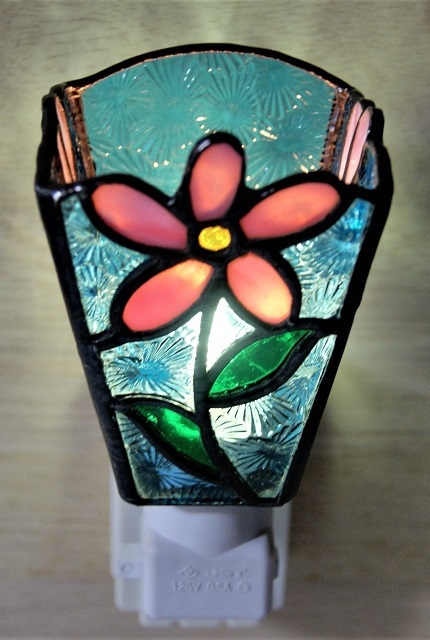 小さなお休みランプですが、ランプ制作のような作業内容です。1ピースずつカット、半田、組み立てとお休みランプは細かい作業を要します。小さくても本物のステンドグラスランプです。模様入りのブルーガラスにピンクの花、グリーンの葉で3面に模様を入れを入れ、背面は模様無しの4面体お休みランプです。