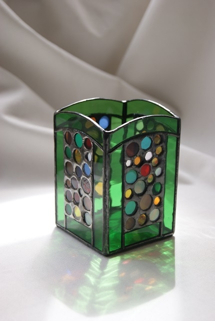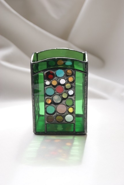枠組みにグリーンガラス、丸くカットした沢山の色ガラス使用。