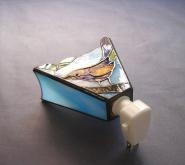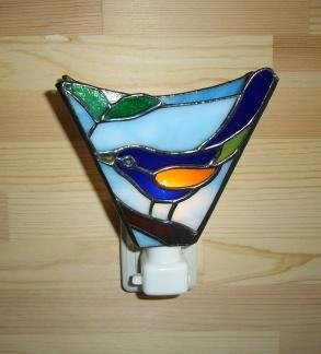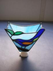 バージョンアップしたおやすみランプ小鳥の一種。グラデーションの青地に青とオレンジと黄緑の鳥。まさに幸せを運んできそうなランプです。電球2種付き。サイズ 14cm W12cm D6cm。 代引き手数料なし。