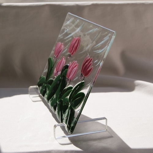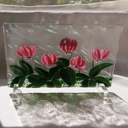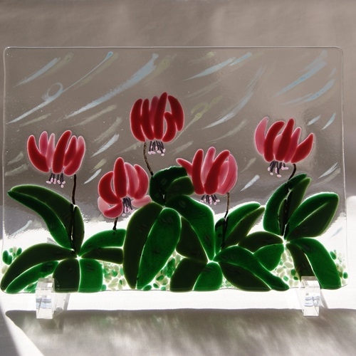 モチーフはカタクリの花。土台となるクリアーのガラスに、絵付けで風を表現しました。