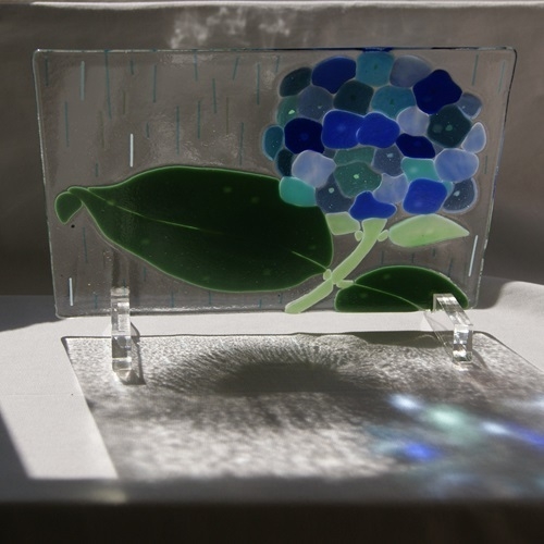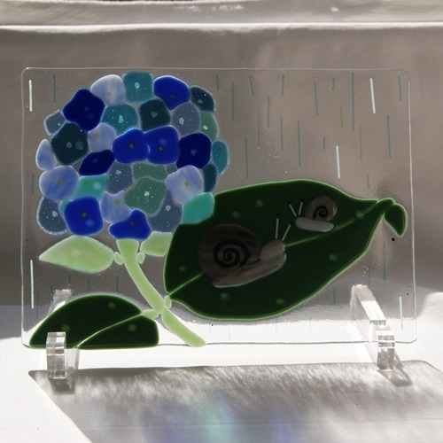 モチーフは紫陽花とカタツムリ。土台となるクリアーのガラスに、ストリンガーという極細のガラス棒で雨を表現しました。