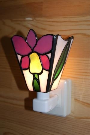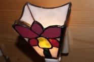 光を入れると、鮮やかな赤に近いゴールドピンクに咲いてくれます。バックはモトル入りの白、花はゴールドピンクに若草色。夜の片隅にやさしく咲いた一点もの。サイズ H14cm,W8.5cm,D5cm電球 10W