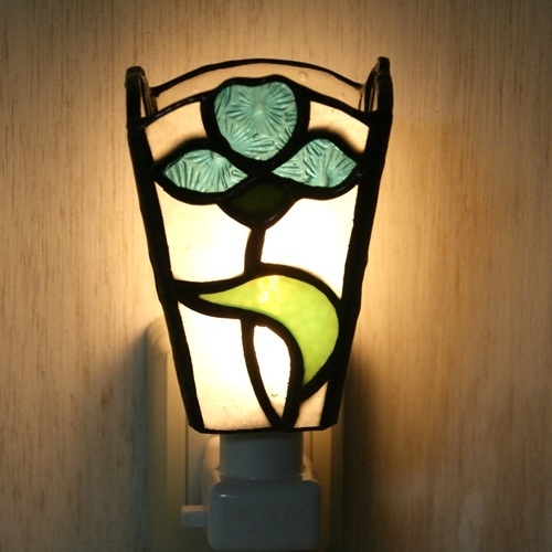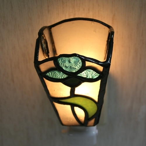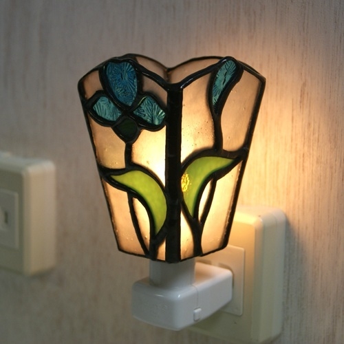 白いリップルガラスのバック、青色の花、緑の葉。重厚感のあるランプです。