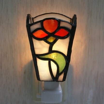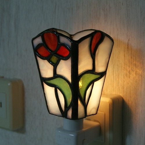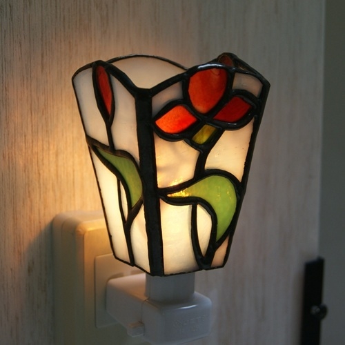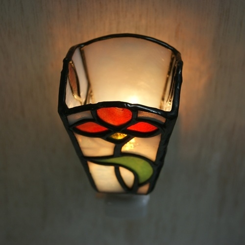 白いリップルガラスのバック、赤い花、緑の葉。重厚感のあるランプです。