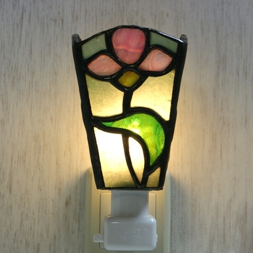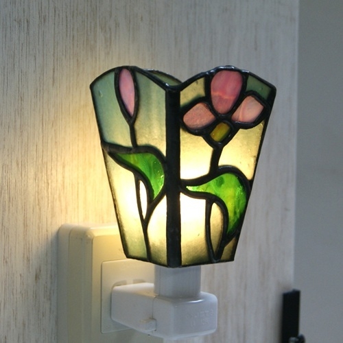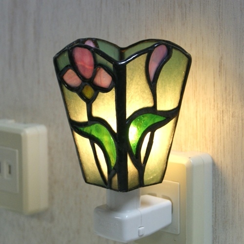 グリーンのリップルガラスのバック、ピンクの花、緑の葉。重厚感のあるランプです。