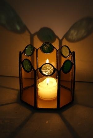 底面は八角形でその周りに、半円にくり抜いた所に、玉を入れたガラスを取り付け、八角柱に組み立てました。シンプルですが上部の玉に灯りがあたると、思いがけない輝きになります。正確な作業が要求される作品で特別価格です。サイズ H9cm、W10cm、6時間蝋燭付き (B~H共通コメント)ガラスは アンバーと濃淡グリーン、濃淡ブルー