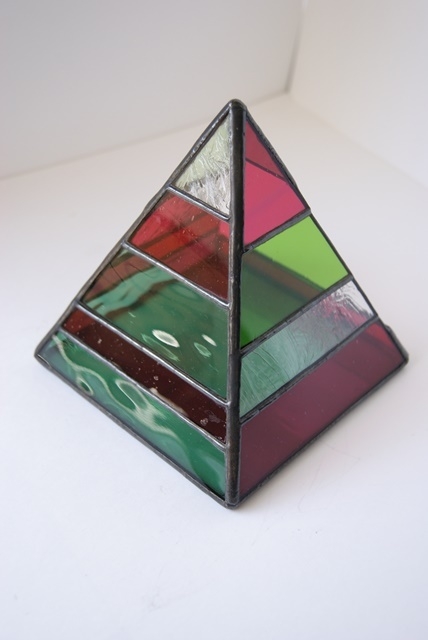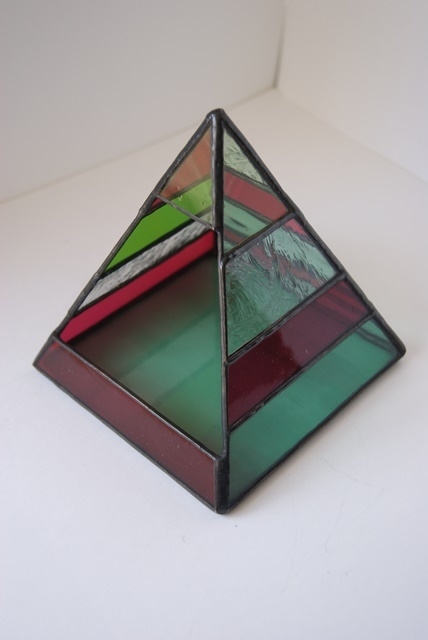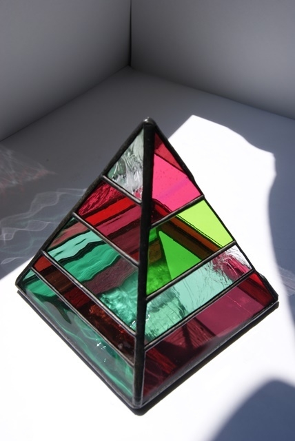 ピラミッドパワーを信じて、華やかな小物入れが完成しました。アンティークガラス使用なので、窓辺に置いて日の光を浴びると美しい輝きを放ってくれます。時計、アクセサリー、お金等、小物入れとしても又、サボテン、ミニ植物などを入れても楽しめます。〔植物を入れる時は受け皿を御使用下さい。)
