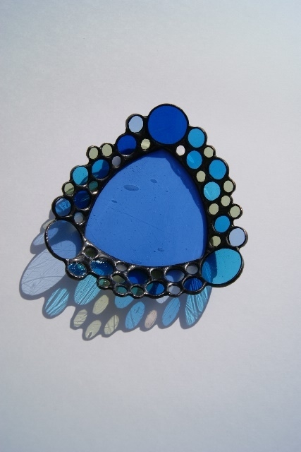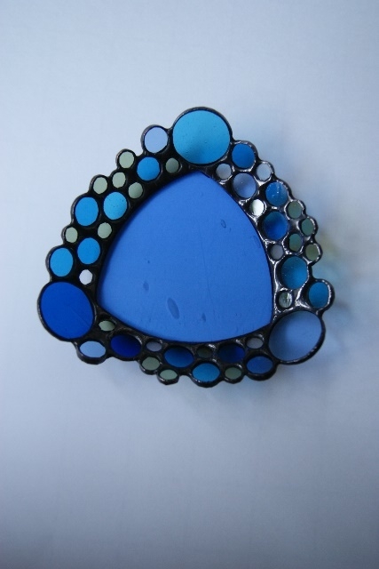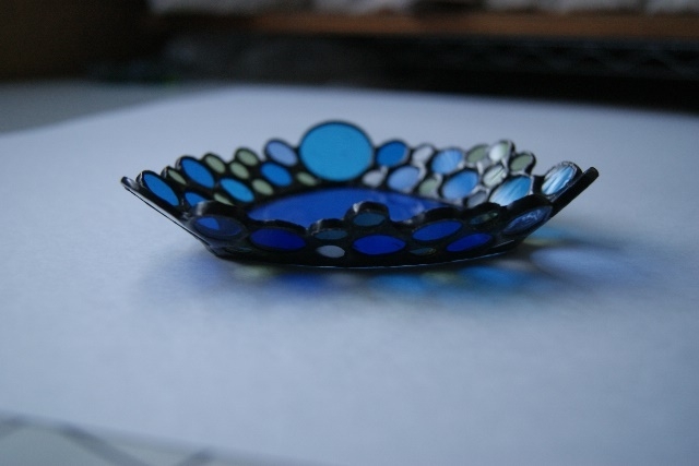 丸みを付けたブルーの三角底。すべてアンティークガラスの大、中、小の丸ガラスをモザイクで縁に積み重ねてお皿にしました。