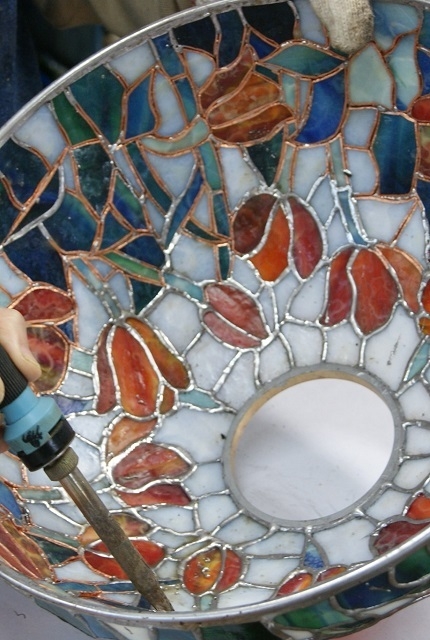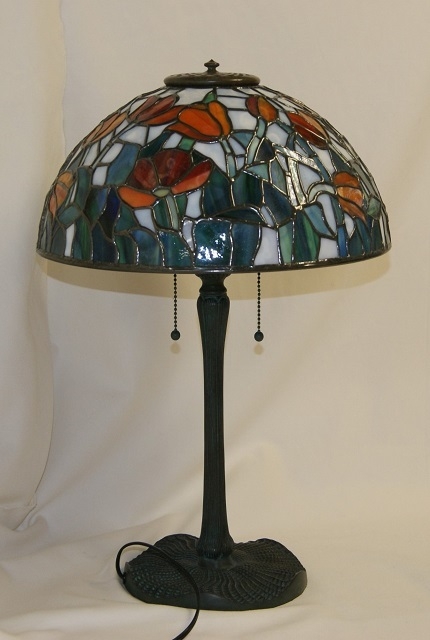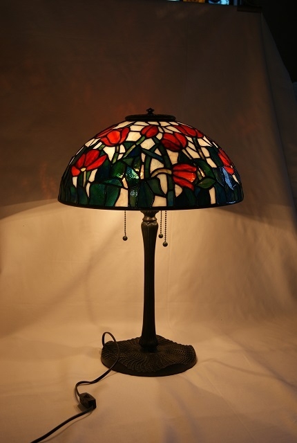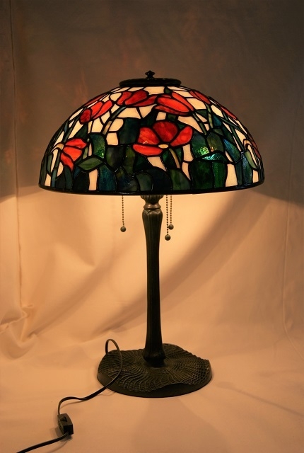 ガラスの入手が困難な状況が続いており、ティファニーランプが思うように作れない現実です。当分は在庫で制作できますが、ガラスメーカーの復活を願うばかりです。花は赤とオレンジ、葉はグリーンの濃淡にブルー、バックガラスは白でいずれもリングモトルの入った、透け感のある最高級のガラス。
