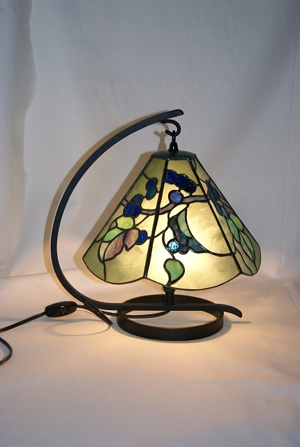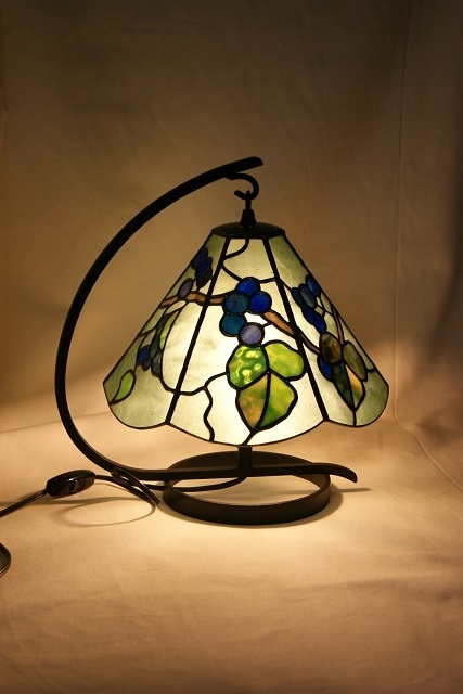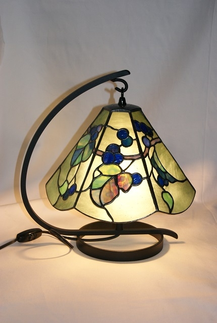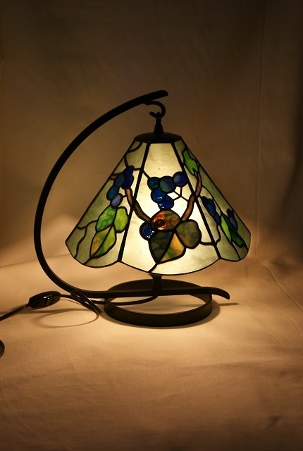 野ぶどうの蔓が一周するようにするため、六面の模様を全て異なるデザインにしました。バックガラスは氷様のグリーン、葉は秋色を出せるようにグリーンに多色、実は薄青~赤紫のガラス。何処か郷愁を感じさせる野ぶどう、派手では無いが心を引きつけられる、そんな思いを込めて制作しました。六面が全て異なるデザインの為、葉の位置やぶどうの位置とガラス選びに苦労をしました。野ぶどうの灯りが至福の時間を、お届け出来ますように…。