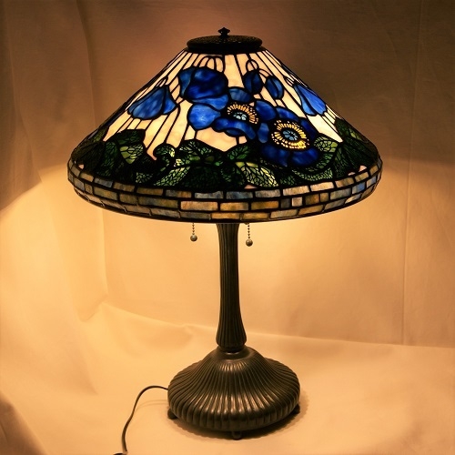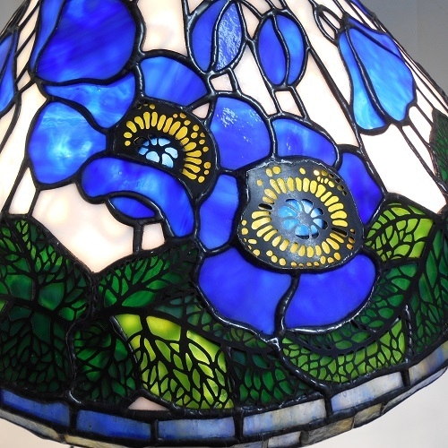 根強い人気のティファイランプ(完全レプリカ)です。今では本当に幻のガラスなってしまった、オセアナガラス(花・ブルー)とリンズガラス(ボーダ3段)の大切に保管していたものを使用しました。(ティファニーランプを制作できるガラスとしては最後です)