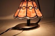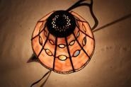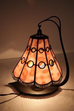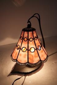 可愛いピンクガラスをバックにアンティークのストリーキーガラスが、丸のアクセントで輝きます。裾のスカラップは光を反射してくれるように、透明のリップルガラスを使用。部屋の中に花が咲いたように明るくなります。1点もの。サイズ H28㎝、W23㎝、D21㎝電球40W