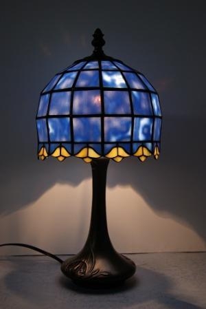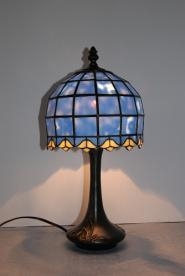 今では手に入らない旧オセアナガラスで作った、積み上げ14面体のランプ。水色が美しく裾の黄色の花を引き立てます。部屋の電気を消すとブルーは一層鮮やかに、点けるとやさしいブルーになります。ベースは重量感のある大変良いものです。半値の価格で在庫処分です。 サイズ H38㎝、W19㎝、D19㎝ 電球40W