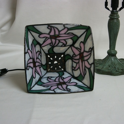 ササユリはベビーピンクの透明感あるガラス、葉は優しいグリーン色でデザイン化しました。