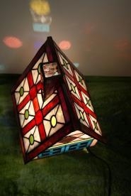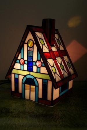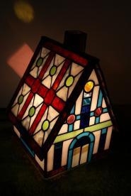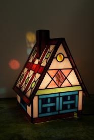 沢山の色使いと細かなデザインで制作しました。ハウスの壁は淡いピンク色、屋根はリングモトルの白地と、真紅と、若草色のガラス。窓はブルーのグラデーションガラスが彩りを添えます。クリスマスに贈る特別価格。1点のみ。サイズ H24cm、W18.5cm、D18cm電球 40W