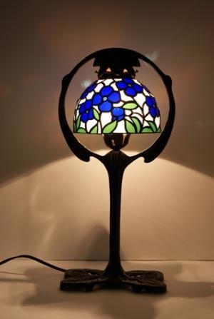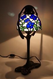 白・青・緑と単純な色の組み合わせながら、心洗われるような清々しいランプになりました。重厚なベースの腕を丸くしたような中に、可憐な大きさの花が灯り、至福の時間を運んでくれそうです。オリジナルランプの一点もの。手持ちベースの為格安にてご提供。オールアンティークガラス使用。 サイズ H42cm、W21cm モールドサイズ H11cm、W15cm 電球40W