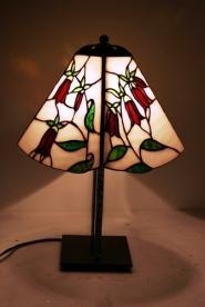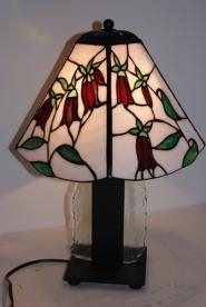 郷愁を誘う大好きなホタルブクロをランプにして見ました。白地のバック、ゴールドピンクの花、3種類のグリーンの葉とがく。ガラスは最高級の物を使用しています。ベースは鉄製で支柱部分には1cm厚のガラスが、アクセントに挟まれています。どっしりとした風格あるベースです。鮮やかさを写真ではお伝えできないのが、残念です。1点もの サイズ H40㎝ W21㎝ D30㎝ 電球40W