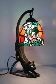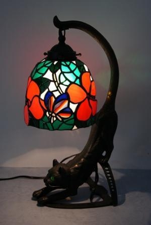 憧れの猫ベースに、大胆さと精密さでハイビスカスと蝶を配しました。細長円形のモールド、猫の目にも緑の灯りが入ります。ガラスは最高級のオールアンティークガラス。ベースが在庫使用のため出来た価格です。ベース代は入っていないに等しい、特別価格の一点もの。サイズ ベース H40.5cm W16cm