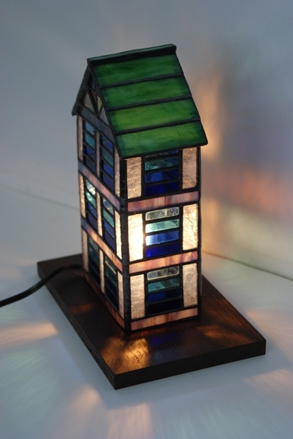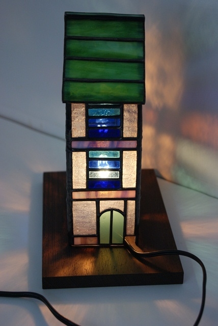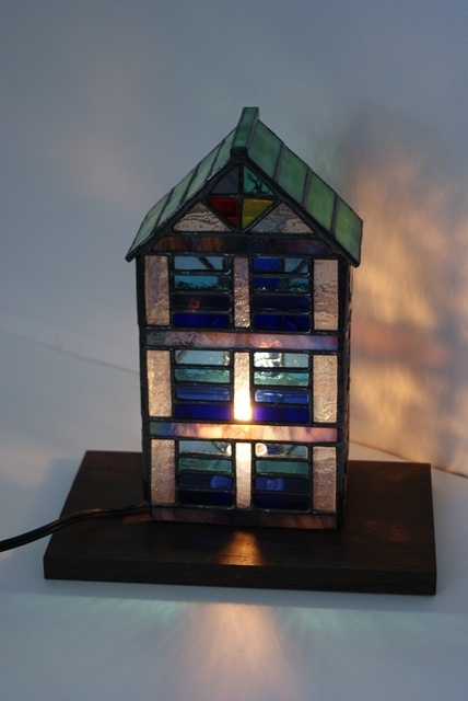 電球を入れなくても窓辺で、自然光で楽しめるように、透明なガラスで創ってみました。ハウスランプの割には小さく灯りを入れないで、置物として楽しんで頂きたいランプですが、それでは・・と言う方のため小さめの電球で楽しんでいただけるようにもしました。置き台として木製ライト付きと、ガラス台をご用意しました。