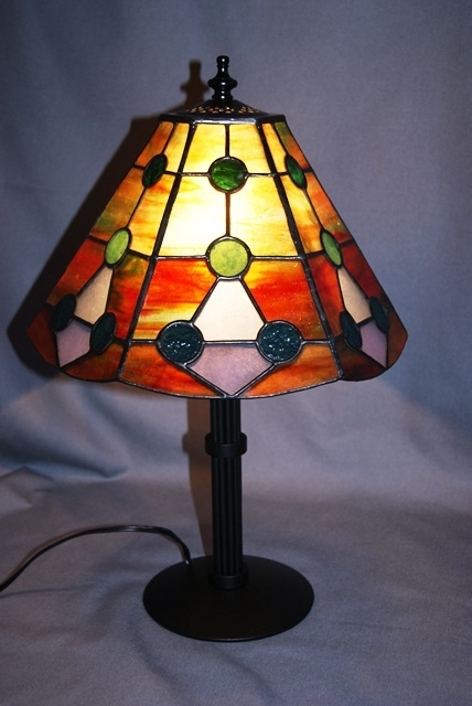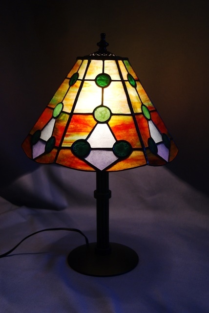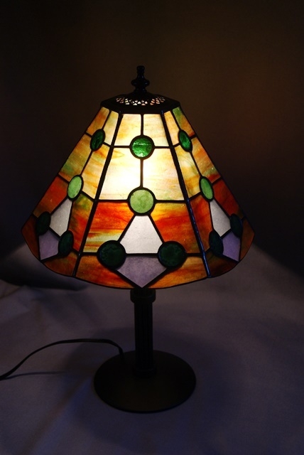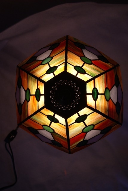 下側に行くにしたがって赤が濃くなるように、拘って色取りをしました。緑の玉は3種類使い、下の三角形は上が白、下が薄紫です。不思議な色のコントラストをお楽しみ頂きたいランプです。(大場将史デザイン)