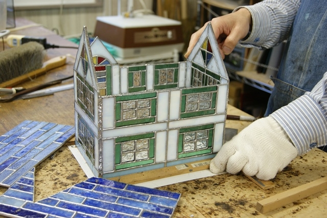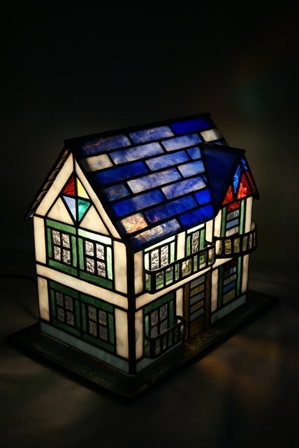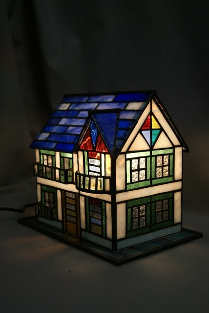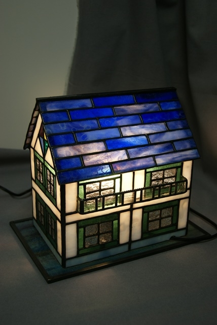 美しいブルーの屋根、玉虫色に輝く白い壁、グリーンの窓枠、光の拡散が綺麗であることを重点に置くと、入り組んだハウスランプが敬遠されてしまいますので、どのようにして夢のあるものが作れるか悩みます。華やかに夢のある空間をお届けしたい思いで、拘りのハウスランプを作りました。