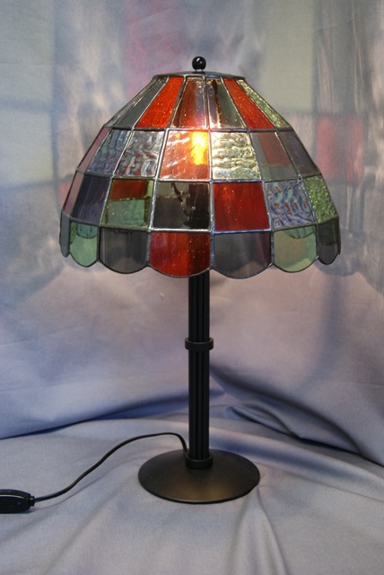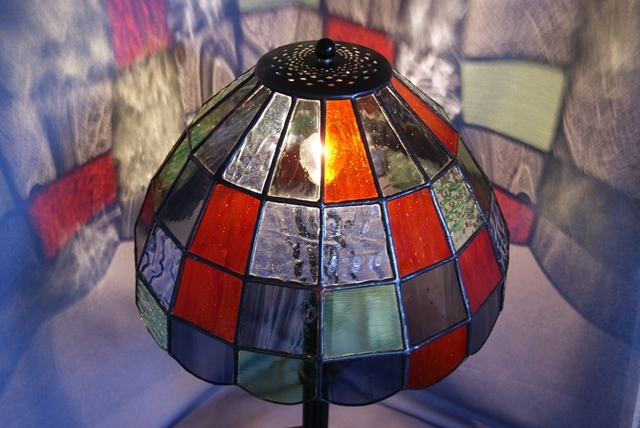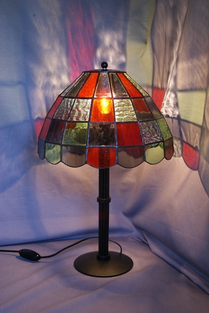 懐かしいレトロな16面体のランプが出来ました。大分前にガラスだけカットしてあったものが、日の目を見ることが出来ました。手の込んだ模様入りランプも魅力ですが、ステンドグラスランプの基本のようなシンプルランプも又、魅力です。赤、黒、緑、青の透明な輝きをお届けします。